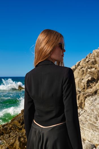 Style Note: A timeless take on modern elegance. This black jacket features a deep V-neckline and a tailored fit that creates a sophisticated silhouette. Pair it with denim for a minimal daytime look or with sleek heels for a powerful evening statement. Perfect for an elegant and confident presence in any setting.